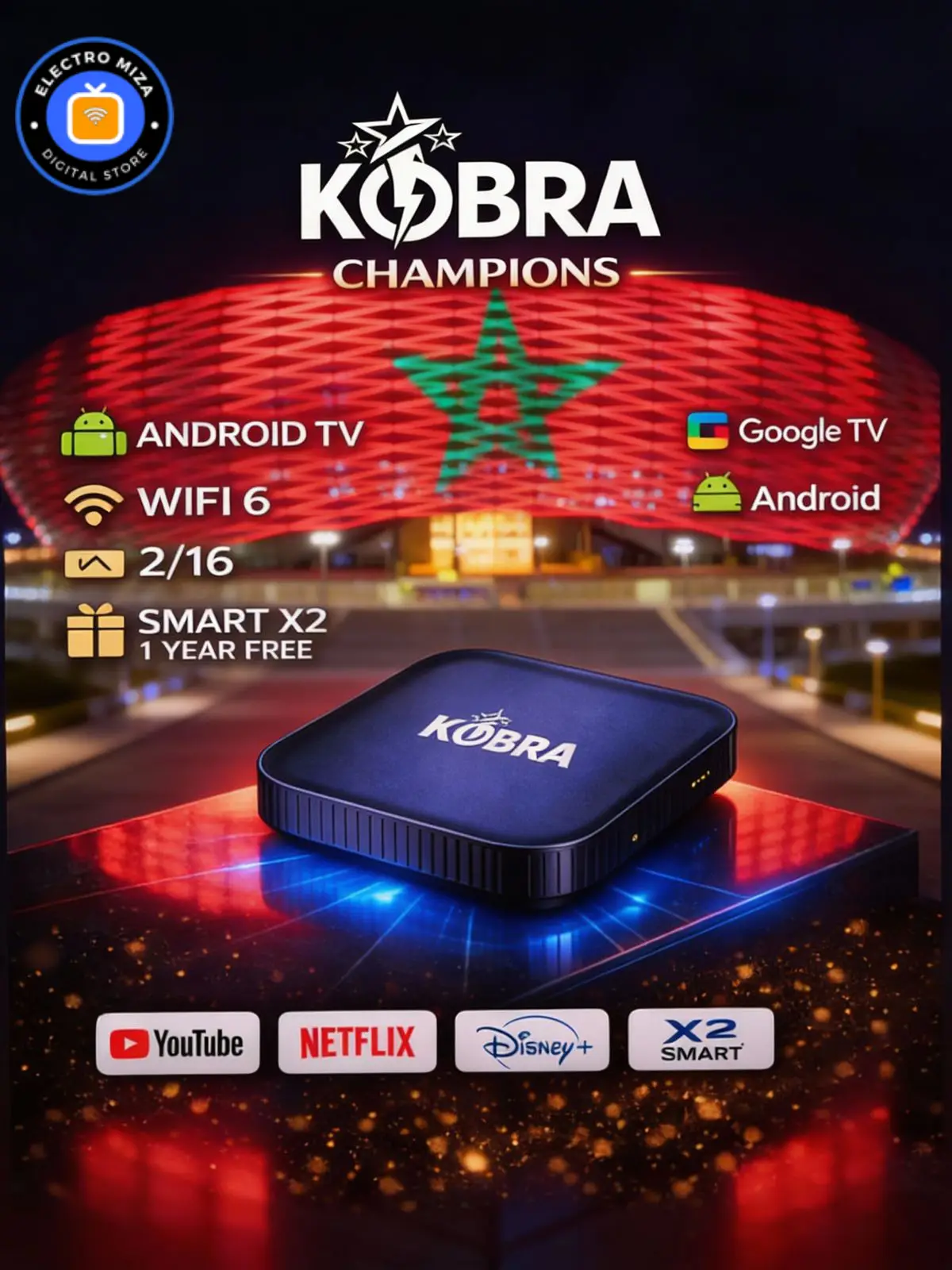 يُعد KOBRA Champion Android Box 2026 من أقوى أجهزة الأندرويد بوكس الحديثة، حيث يجمع بين Android TV و Google TV مع دعم أحدث التقنيات مثل WiFi 6 وواجهة Projectivy Launcher، ليمنحك تجربة ترفيه ذكية وسلسة بجودة عالية.